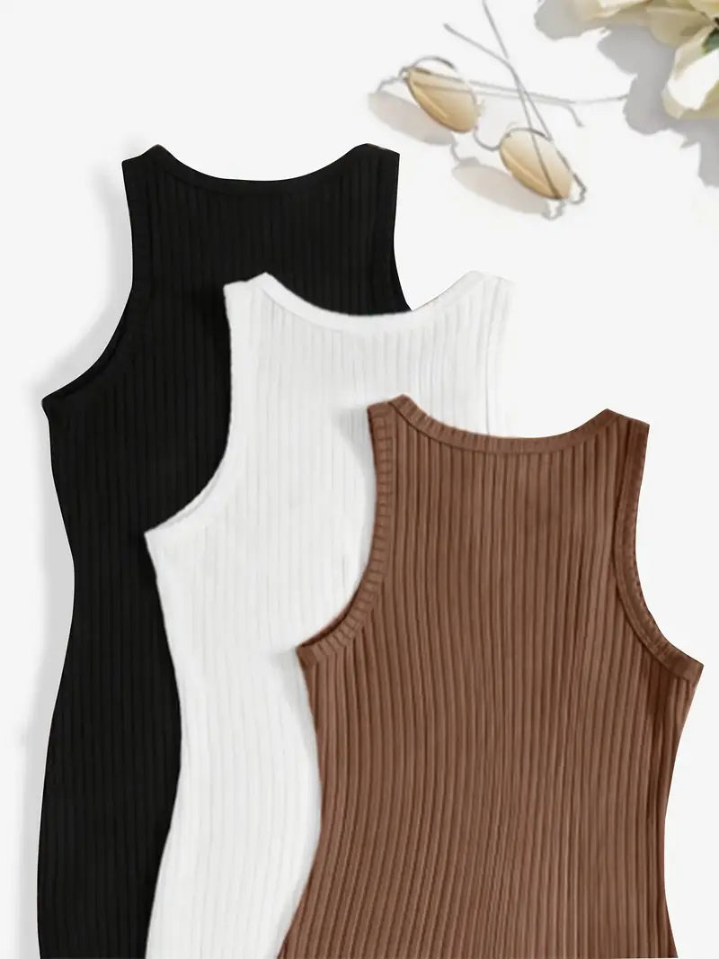 Robe Moulante Côtelée pour Femme - Sans Manches, Col Rond en 3 coloris Noir & Blanc avec Accents Marron, Tissu Extensible et Comfy. Parfait pour le Printemps/Automne